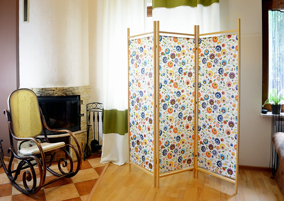 Ozdobny parawan pokojowy zbudowany z sosnowej ramki wypełnionej tkaniną z jednostronnym nadrukiem Folk.