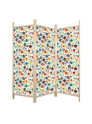 Dekoracyjny parawan pokojowy wykonany z sosnowej ramki oraz tkaniny z jednostronnie nadrukowanym motywem Folk. Za pomocą systemu skrzydeł zamontowanych na zawiasach wszechstronnie dzieli i dekoruje przestrzeń mieszkalną oraz użytkową.